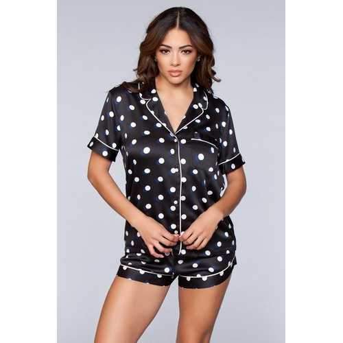 Collared button down sleep shirt with matching shorts Imported polyesterPoly bag packaging with hand tag Packaging dimensions: 13x10x1Size: 3X/4XColor: Black/ White